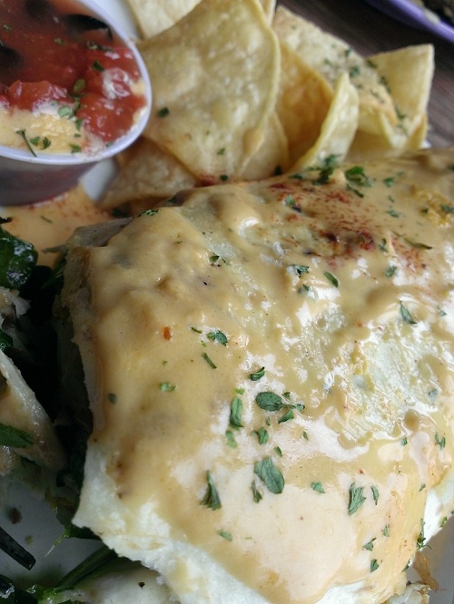My breakfast burrito was an entire rolled-up breakfast. It’s seasoned tofu with green chilies, onions, garlic, home fries, spinach and “cheese” all wrapped in a giant tortilla and served with chips and salsa.