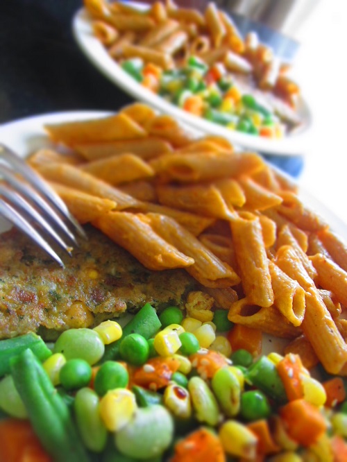 To hide the fact that I just boiled up frozen vegetables, I quickly sautéed them with soy sauce and sesame seeds. Not-vet-vegan hubby gave the meal one thumb up–only because I made whole wheat pasta and he’s still not on board with the texture and flavor. I admit, it took me a while to warm up to that too when I first switched. Easing in with 50% whole wheat is a good way to transition.